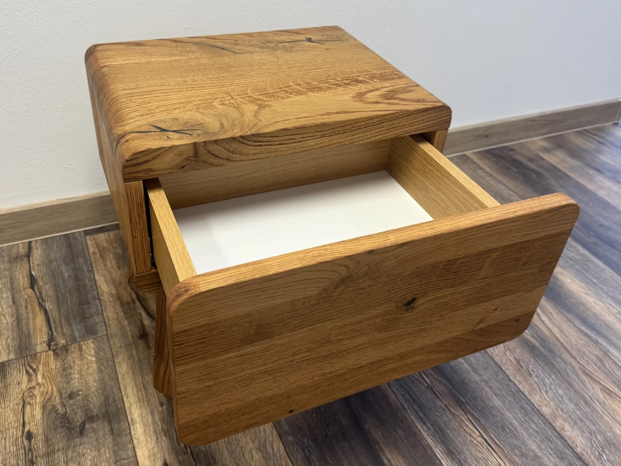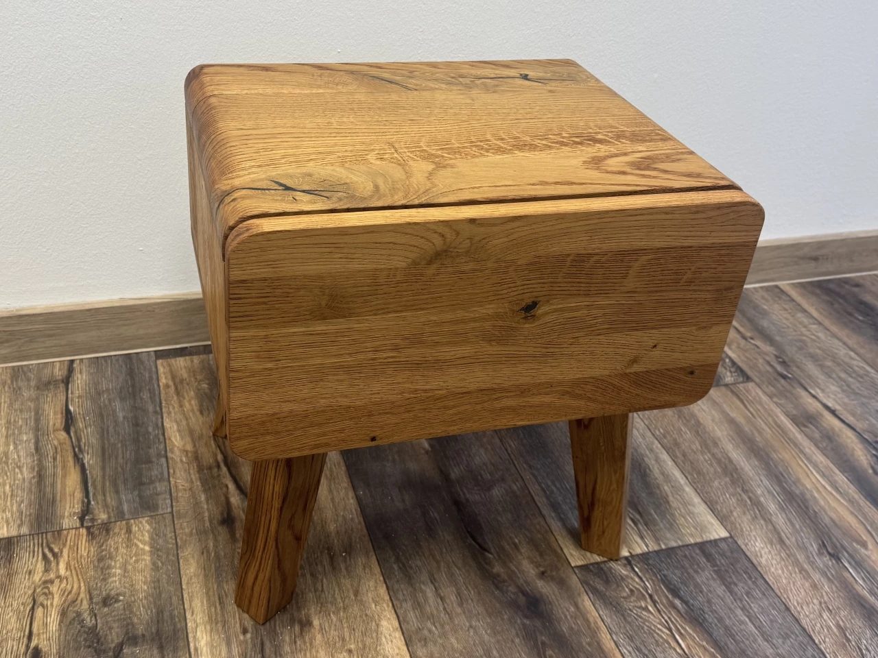 Noční stolek Diamant je vyrobený z masivního dubového dřeva. Zaoblené hrany podtrhují jeho eleganci a moderní charakter. Zároveň zvyšují bezpečnost a komfort při každodenním používání.